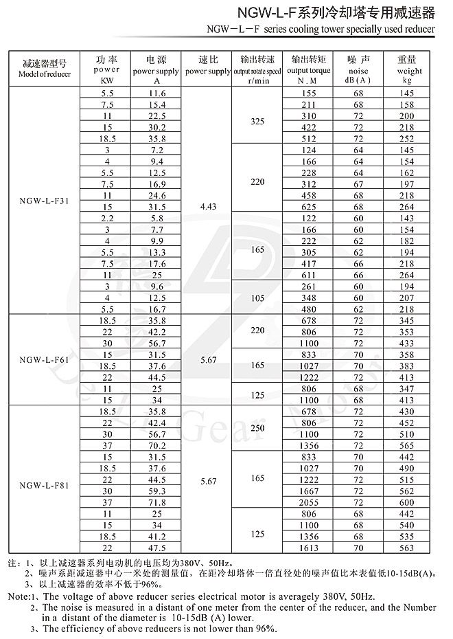 NGW-L-F系列冷卻塔專用減速器系上海交通大學設計,是專門為配套200~750T/n冷卻塔設計的新產品,其主要結構為立式單級行星傳動。齒輪采用合金鋼經高精度切削加工熱處理而成,具有強度高、韌性好、精度高等優點,同時采用浸油式潤滑,且在密封方面作了改進,從而達到了噪音低、振動小、效率高、不漏油、壽命長的目的。己成為冷卻塔節能降噪的最理想產品,被廣泛用于化工、輕工、醫藥、冶金、高級賓館、民用建筑等行業。